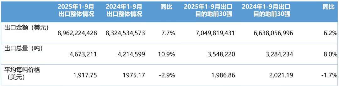 根据最新海关统计,1-9月出口总额达到89.62亿美元,同比增长7.7%;出口量约 467.3 万吨,同比增长10.9%。