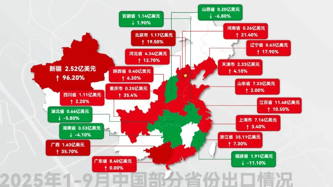 其中新疆同比增长超过96.2%,成为今年前三季度的“黑马”。这与中欧班列常态化运营密切相关,西部地区在出口到中亚、俄罗斯市场方面更具区位优势。